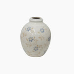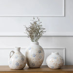 Sweet ceramic bud vase adorned with petite blue flowers. Perfect for holding foraged flowers.