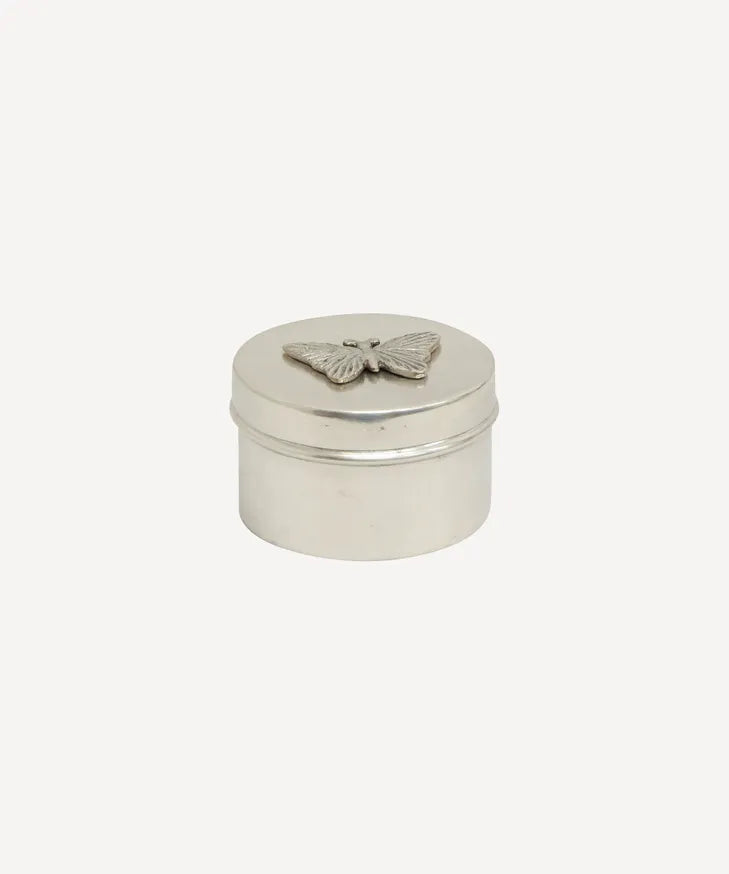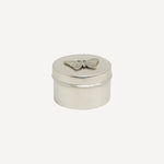 Silver metal cannister with butterfly motif and bamboo design. Place jewellery or treasured trinkets inside.