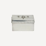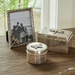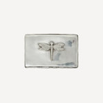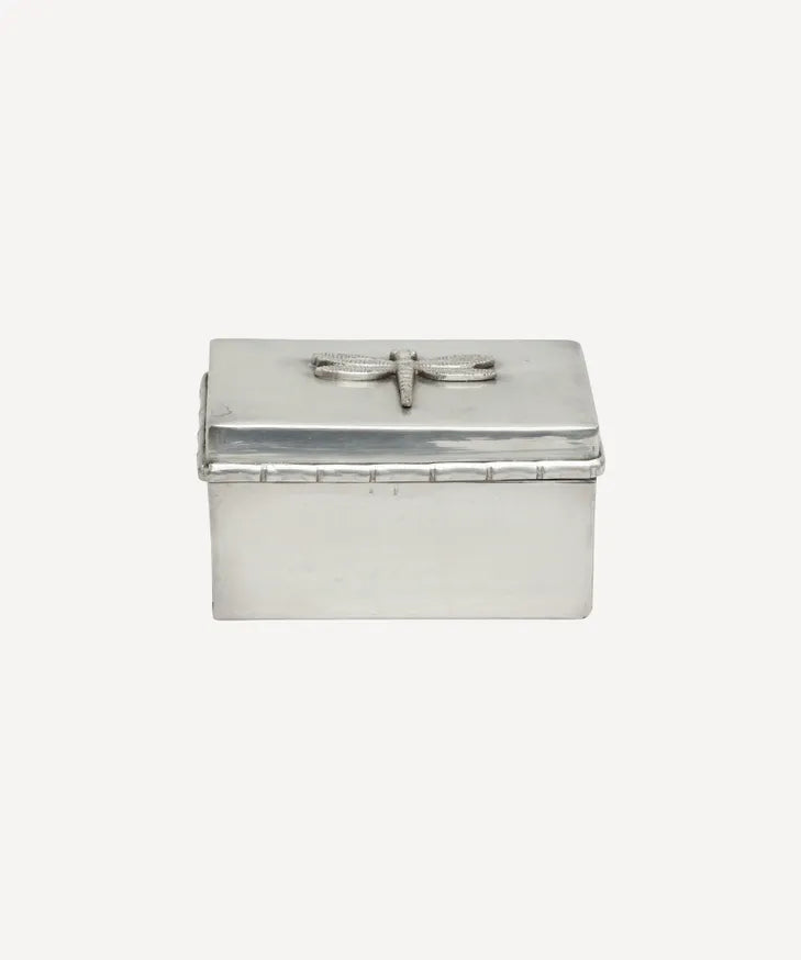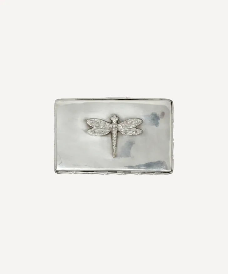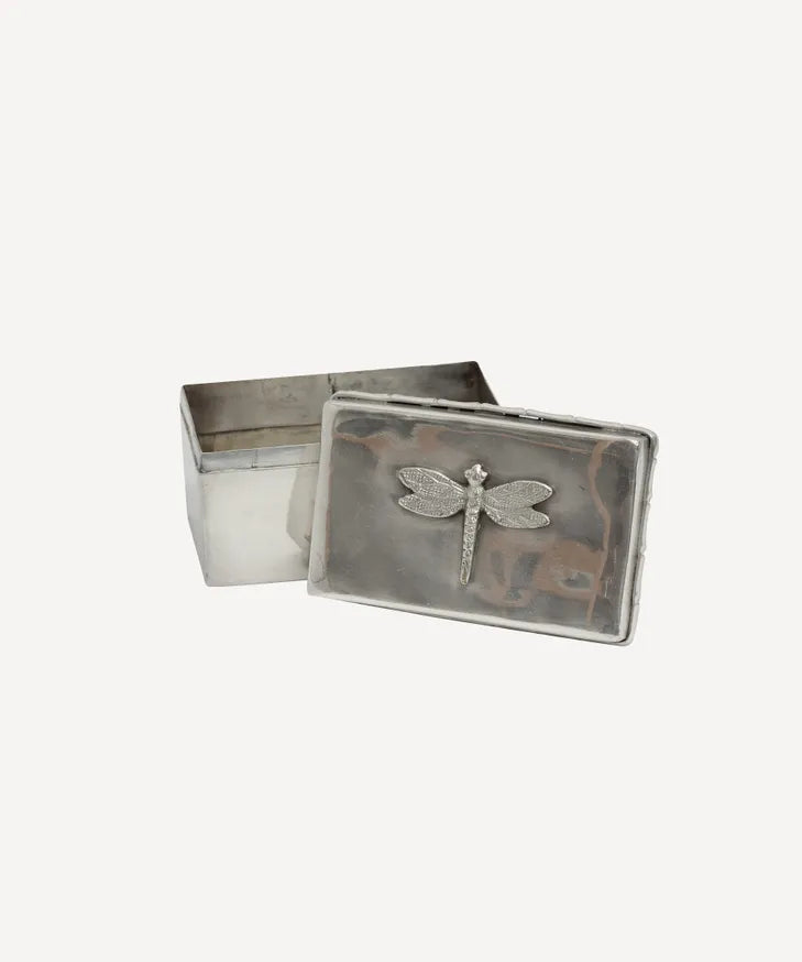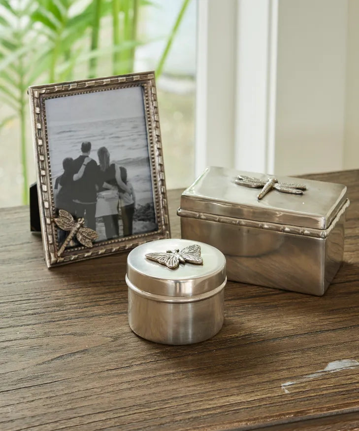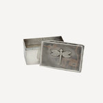 Silver metal cannister with dragonfly motif and bamboo design. Place jewellery or treasured trinkets inside.