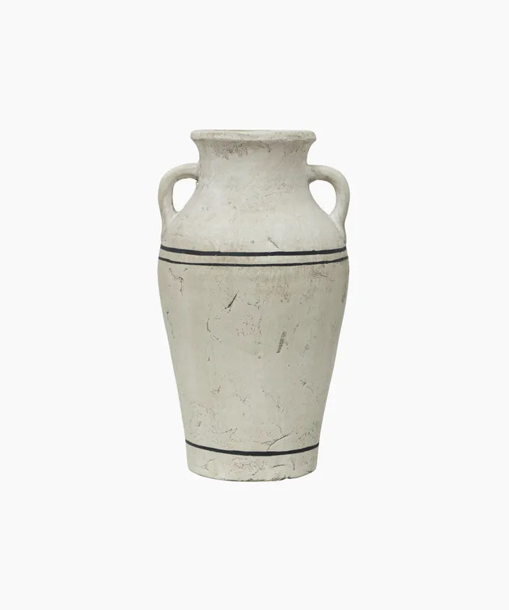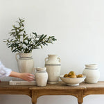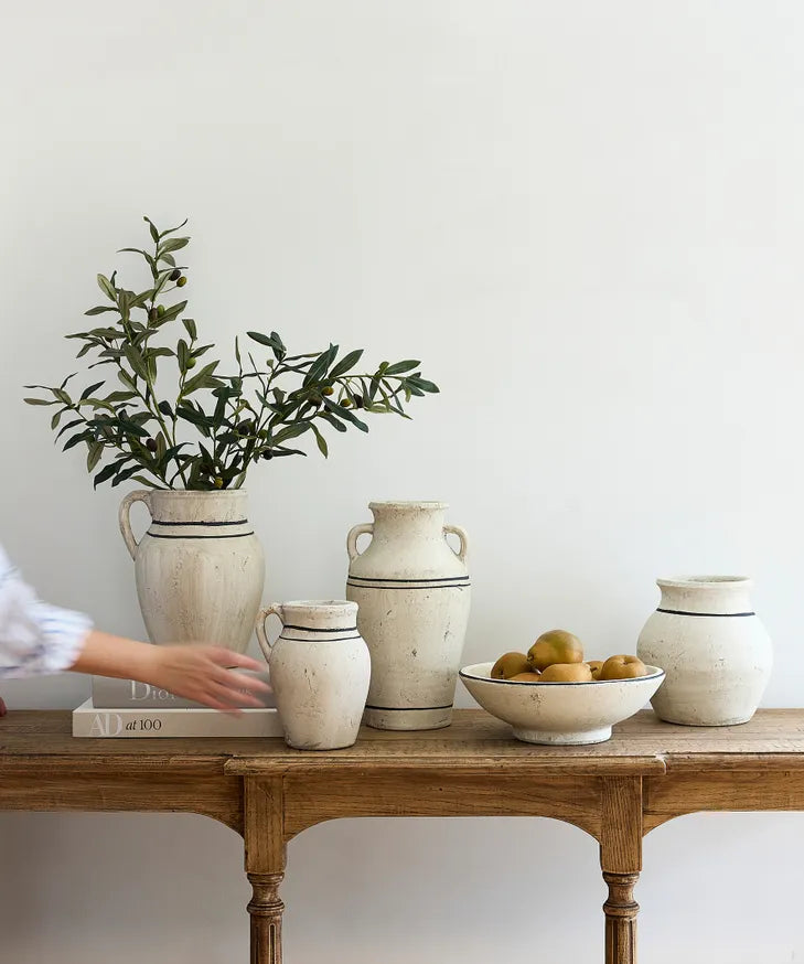 The Lisbon collection is a primitive style ceramic made from terracotta. Each piece has a chalky white finish adorned with imperfect black line detailing that makes each piece unique.